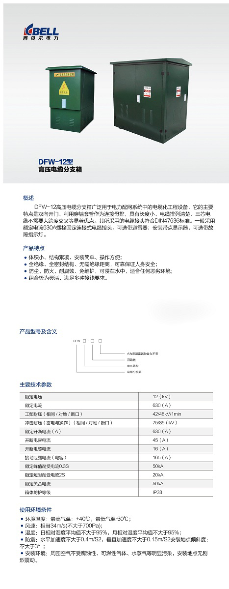 DFW-12高壓電纜分支箱廣泛用于電力配網(wǎng)系統(tǒng)中的電纜化工程設備,它的主要特點是雙向開門、利用穿墻套管作為連接母排。